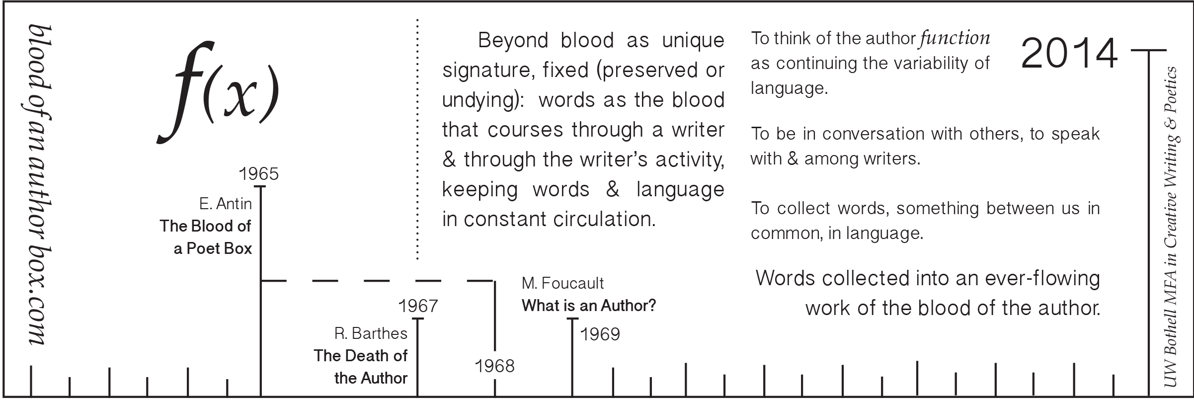 With this project we hope to be in conversation with Antin’s The Blood of the Poet Box (1965-68). We want to think about the blood of the author as moving beyond blood as unique signature, fixed (and in the case of the blood slide, preserved or undying), to reconceive the blood as words that move through a writer and that through the writer’s activity or pumping of the blood, words and language are kept in circulation. To think of the author function ƒ as helpmate to the continuing richness and variability of language—not to individual nodes of unique genius, but shared genius and genesis—a signature, but in language, not in name or specificity.